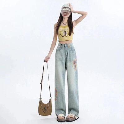 ハイウェスト デニムボトムス レディース 快適性 中国風刺繍 ったり モップパンツ 着痩せ ゆ ストレートパンツ ワイドパンツ ジョガーパンツ ジーンズ