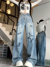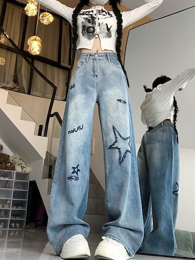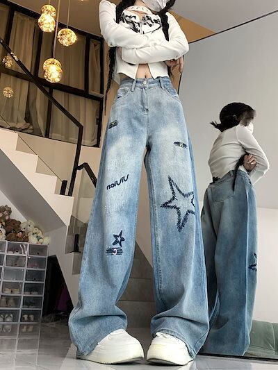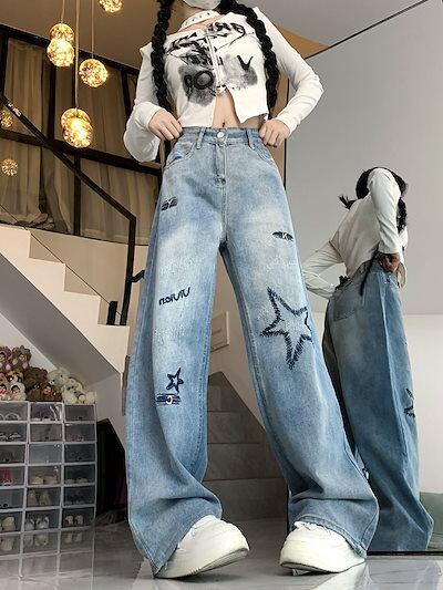 アメリカンレトロな雰囲気のスター刺繍入りレタージーンズ女性用ハイウエストルーズスリムストレートフロアモップパンツ