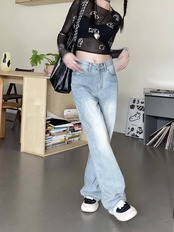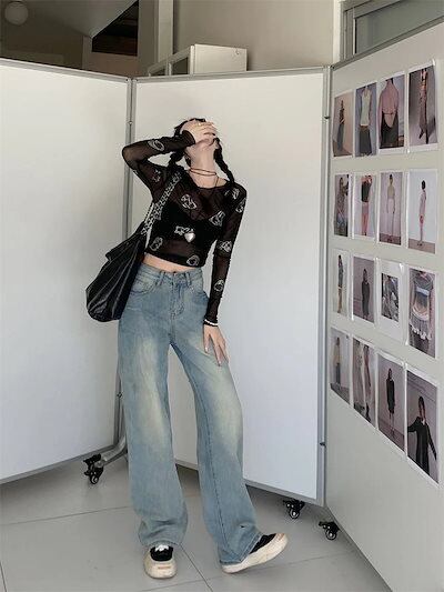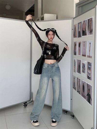 ジーンズ レディースKt猫刺繍ジーンズレディース春夏ハイウエストストレートルーズワイドレッグフロアレングスパンツ