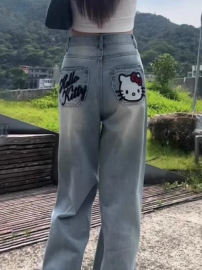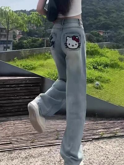 ジーンズ レディースKt猫刺繍ジーンズ女性用夏ハイウエストストレートパンツルーズワイドレッグフロアモップパンツ