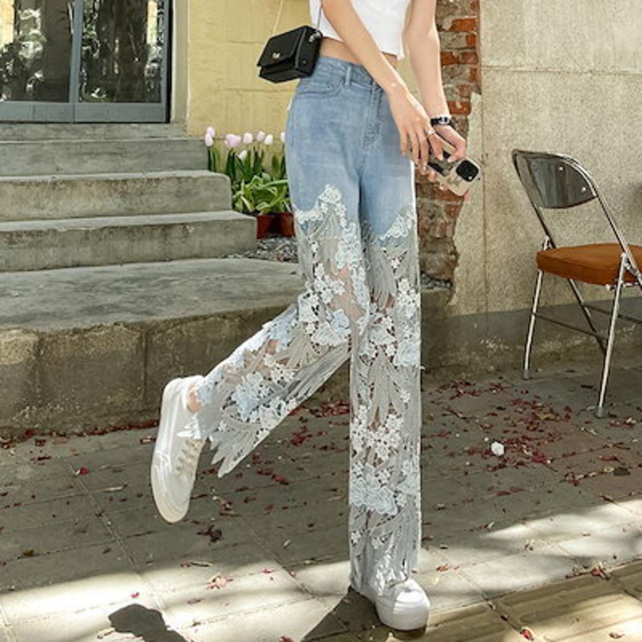 2024新作 夏 デニムパンツ ワイドパンツ 刺繍 レース 切り替え 透かし彫り ストレート ゆったり レディース ロング デザイン カジュアル レトロ 百掛け 韓国ファッション