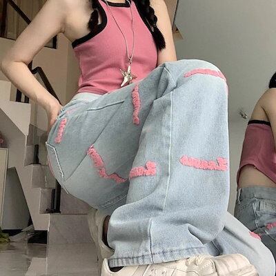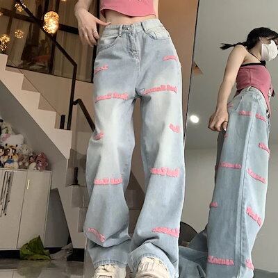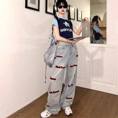 英字デニムパンツ 刺繍 デザインデニム ロゴ ジーンズ ジーパン ルーズ パンツ ボトム ハイウエスト トレンド 定番 カジュアル 韓国ファッション