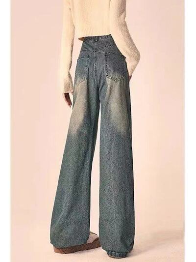 一瞬で引き締まる!高街レトロキティ猫刺繍布ワイドレッグジーンズレディース秋の新作国潮学生ストレートパンツ