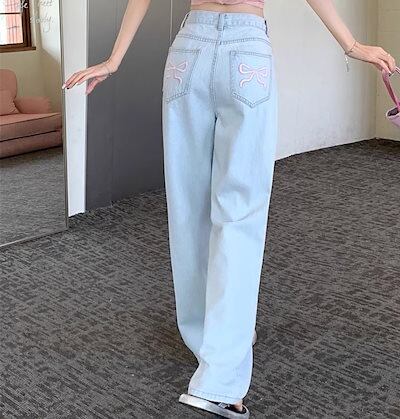 デニムパンツ 蝶結び刺繍 ジーンズ 長ズボン gパン レディース 春 夏 秋 かわいい ストレート カジュアルパンツ ファッション ロングパンツ