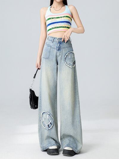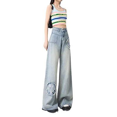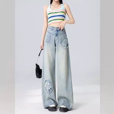 女性用刺繍パッチワイドジーンズ2024春ハイウエストゆったり痩身トールストレートパンツ女性用
