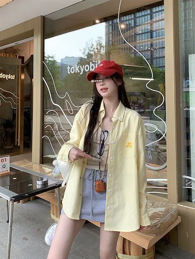 2024秋冬トップス シャツ 長袖 ストライプ ボタン 襟 ゆったり 秋 黄色 イエロー おしゃれ かわいい 韓国ファッション レディース お出かけ