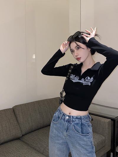 2024秋 長袖 Tシャツ ショート丈 カットソー トップス カジュアル 配色韓国系ストリートへそ出しK-POPタイトネックスリーブ 肌見せ T ファッションレディース かわいいハーフ衣装風冬トップス