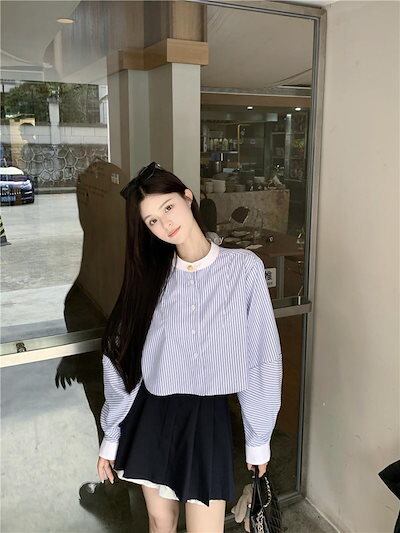 2024秋冬トップス シャツ 長袖 ストライプ ボタン 襟 スタンダードカラー 秋 青 ブルー おしゃれ かわいい 韓国ファッション レディース お出かけ