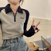 2024秋 長袖 Tシャツ ショート丈 カットソー トップス カジュアル 配色韓国系ストリートへそ出しK-POPタイトネックスリーブ 肌見せ T ファッションレディース かわいいハーフ衣装風冬トップス3
