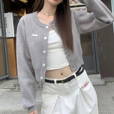2024 秋冬トップス カーディガン ニット セーター ラウンドネック ボタン 長袖 丈短め 細見え 秋 グレー おしゃれ かわいい 韓国ファッション レディース お出かけ