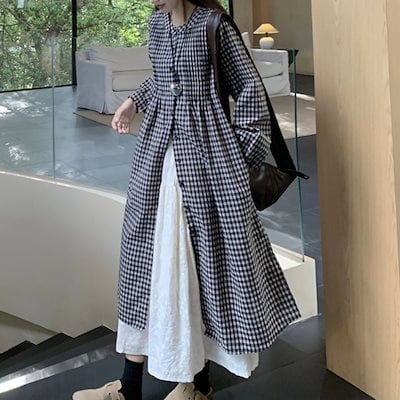 2024春夏ワンピース シャツ ロング丈 ボタン ラウンドネック ギンガムチェック 美脚効果 脚長効果 細見え 秋 黒 ブラック おしゃれ かわいい 韓国ファッション レディース お出かけ