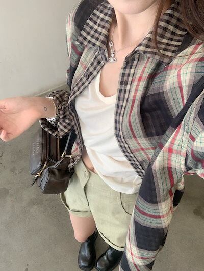 2024夏トップス シャツ 長袖 ボタン 襟 チェック柄 大きめサイズ 丈長め ゆったり 細見え 夏 茶色 ブラウン おしゃれ かわいい 韓国ファッション レディース お出かけ