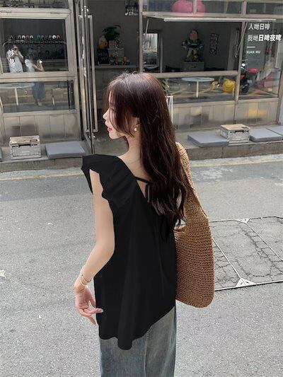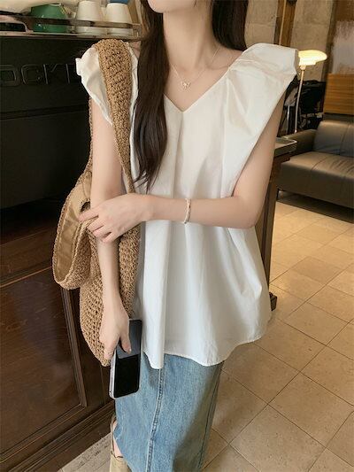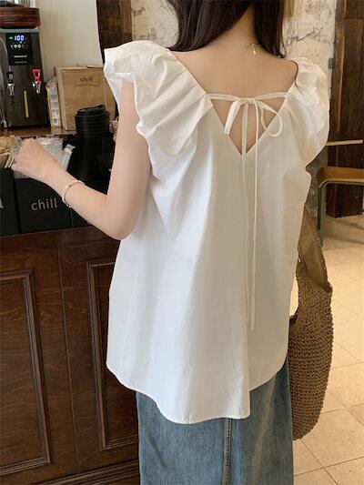 2024夏トップス シャツ リボン 半袖 Vネック 丈長め ゆったり 細見え 夏 白 黒 おしゃれ かわいい ガーリー キュート 甘め 韓国ファッション レディース お出かけ