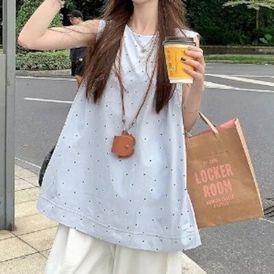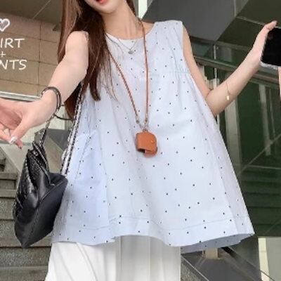 2024春夏トップス シャツ ラウンドネック ノースリーブ ドット柄 Aライン ゆったり 細見え 夏 白 ホワイト おしゃれ かわいい 韓国ファッション レディース お出かけ
