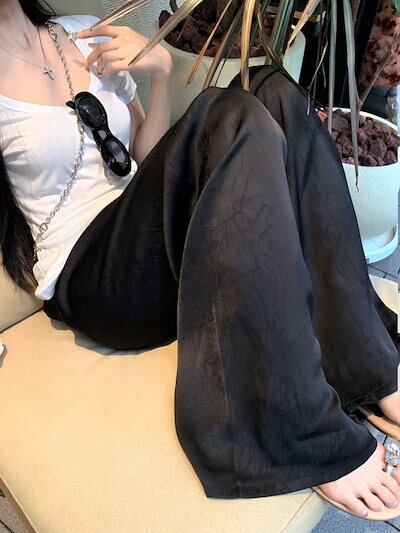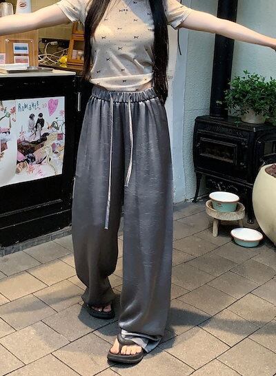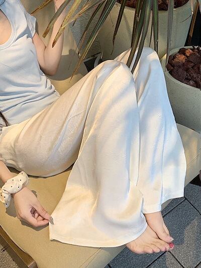 2024 春夏パンツ ロング丈 ウエストゴム ワイド ストレート ハイウエスト 美脚効果 脚長効果 細見え 夏 白 黒 おしゃれ かわいい 韓国ファッション レディース お出かけ