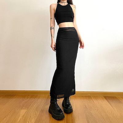 2024 春夏 ロング丈スカート セミ ハイウエスト ハイウエスト 羽織り 脚長効果 美脚効果 細見え aライン スタイルアップ カジュアル ブラックフレンチきれいめシズニック 韓国系