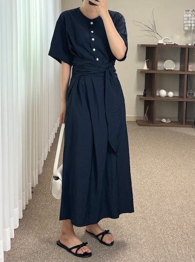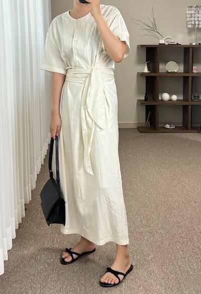 2024 夏 韓国ワンピース ロング丈 ラウンドネック ボタン 半袖 Aライン リボン ベルト ゆったり 細見え 夏 白 きれいめ おしゃれ かわいい キュート 韓国ファッション レディース お出かけ