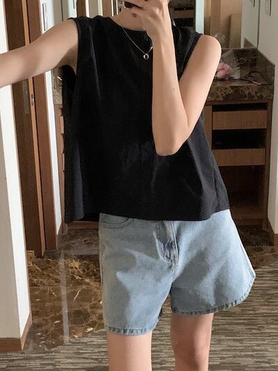 2024 春夏トップス シャツ ラウンドネック ノースリーブ バックオープン ゆったり 細見え 夏 青 黒 白 きれいめ おしゃれ かわいい キュート 韓国ファッション レディース お出かけ