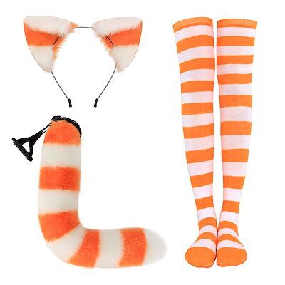 ハロウィンコスプレ ストライプ 猫耳 猫のしっぽ ロングソックス セット かわいい コスプレ ニーハイソックス ハロウィン