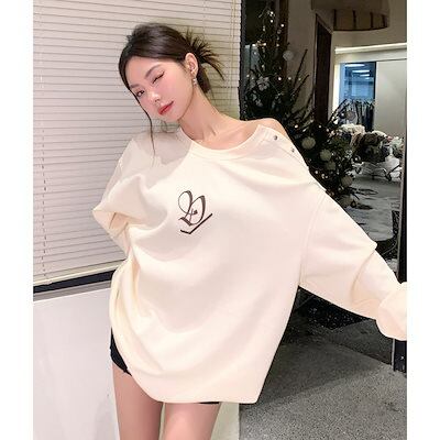 パーカー ストラップレス アルファベット ミドル丈 スウェット レディース 春秋 ルーズ ロングスリーブ Tシャツ トップス