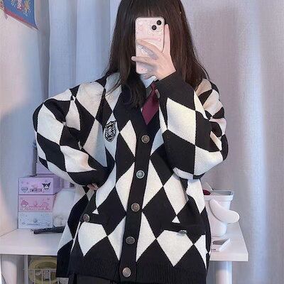 カーディガン キャンパススタイル チェッカーボード ニット ジャンパー カーディガン レディース ルーズ 薄手 長袖