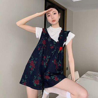 コーデ完成!サロペット プリントデニムストラップパンツ女性夏2024新しいワイドレッグショートパンツ 韓国ファッション
