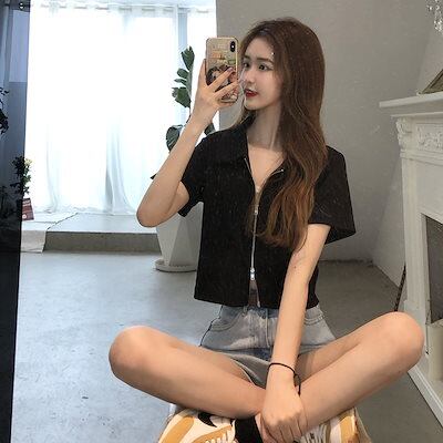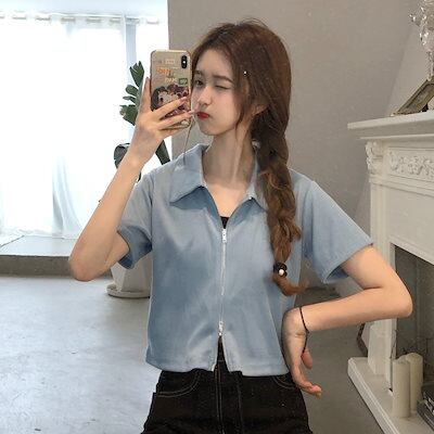Tシャツ 夏 デザイン感 を出すへそ出し ショート丈 トップス ファスナースリムピュアカラー 半袖 レディース 韓国