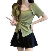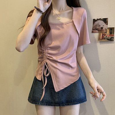 Tシャツ トップス 不規則 なデザインの襟 半袖 夏服 新しいサイズ 引き綱 レディース 韓国