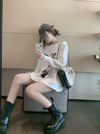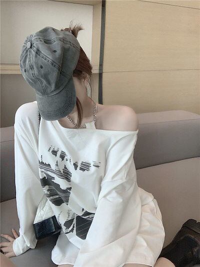 パーカーロンT 韓国新型chic ホワイト肩出し 長袖 Tシャツ レディース ゆったり ins トップス