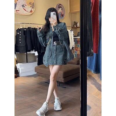 韓国 ファション デニム ゆったり長袖 セットアップ レディース スウェット上下セットデニムコート 2点セット