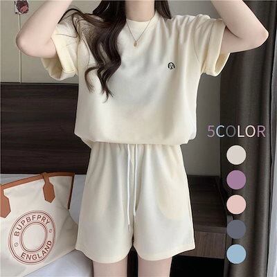 パジャマ?上下セット夏 女性 涼しく楽ちんセット アップルームウェア パジャマ レディース 部屋着 春夏 パジャマ 韓国 スポーツウェア 半袖+ワイドパンツ 2点セット