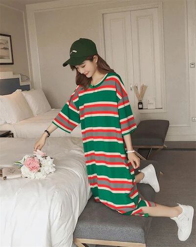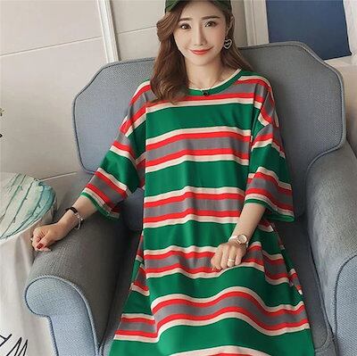大人気 ワンピース 大きいサイズ レディース ワンピース ストライプ 綿 長い 体型カバーになる ゆったり韓国ファッション Tシャツ ワンピース
