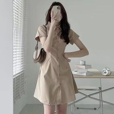 ワンピース 女 着? 韓国の夏のシンプルな気質開襟シングルは腰を絞ってやせて見える半袖シャツ式の小柄なワンピースです