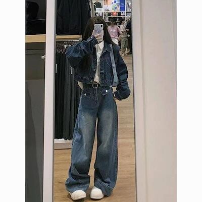 韓国 ファション デニム シンプル レトロ スウェット上下セットデニムコート 2点セット セットアップ レディース
