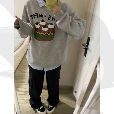 パ一カ一アメリカンレトロかわいいケーキクルーネックパーカーレディース秋2024新作ゆったりけだるい風グレー長袖トップス