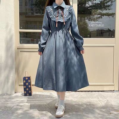 コーデュロイ刺繍のポロネックワンピース少女春秋新中高生腰すぼめミディアムスカート