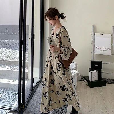 洋風プリントでゆったりVネックの膝丈スカート2024小香風ロング丈高級着やせ新型花柄ワンピース