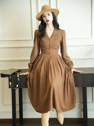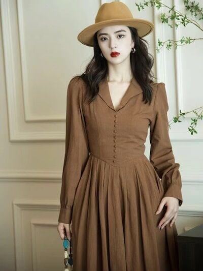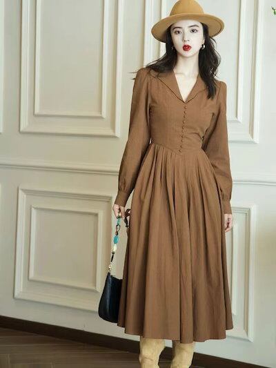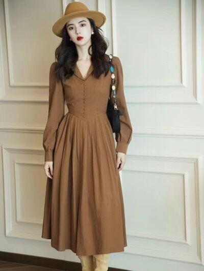 フレンチレトロな雰囲気のセレブ長袖Vネックワンピース通勤収納ウエスト痩せスカート子供秋