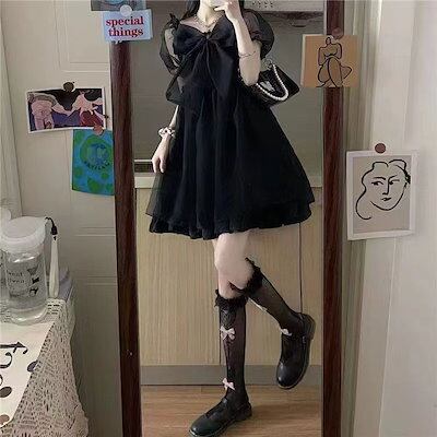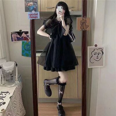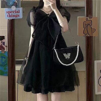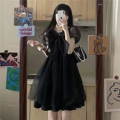 ins風おしゃれロリータワンピース春夏2024新作リボンチュール半袖ポンポンa字スカート女