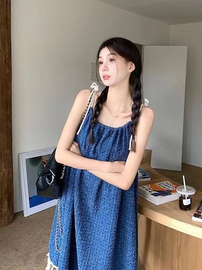 フレンチレトロシックなキャミソールワンピースレディース夏2024新作不規則ミディアムフリンジのゆったりスカート