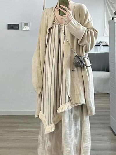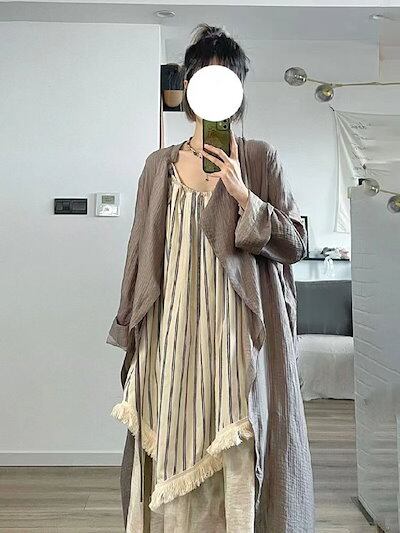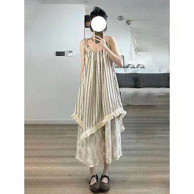 フレンチフレッシュなキャミソールワンピース夏のティーラウンジレトロな文芸ストライプのロングスカートゆったり痩せ見えリゾートスカート
