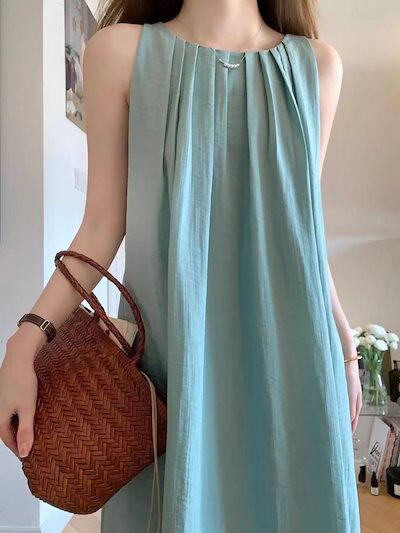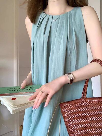 日韓バックプリーツワンピースデザイン感小人数ゆったり着やせ見えミディアム丈ノースリーブタンクトップスカート