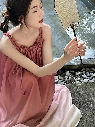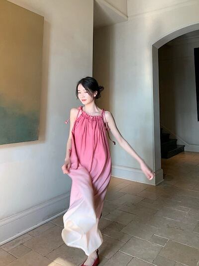 フレンチスウィートグラデーションパウダープリーツキャミソールワンピースレディース夏2024新作ゆったりスリムミディアムスカート