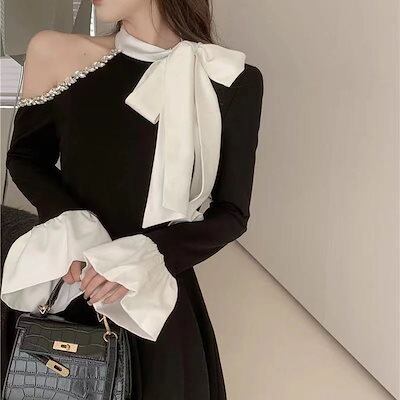 オーバーサイズフレンチヘボン風リボンラインストーンデコルテ黒スカート太ったmm秋の上品エレガント小礼ワンピース