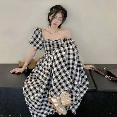 ヘボン風フレンチ高級感がシックできれいなバブルスリーブチェックのワンショルダーワンピースミニデザインロングスカート