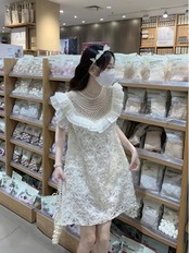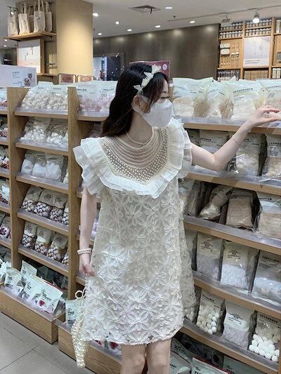 フライングスリーブレースワンピースレディース夏2024新作甘め重工釘ビーズデザインで着痩せ減齢スカート