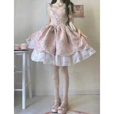 ロリータプリンセススカート夏の新作リボンウエストを収めたフライングスリーブ洋風ファッションポンポンスカート高級感