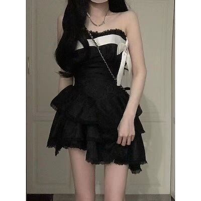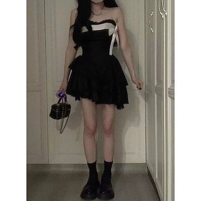 フレンチ純欲風ギャルデザイン感リボン不規則胸ぬぐいワンピース夏の新作ウエストポンポンスカート