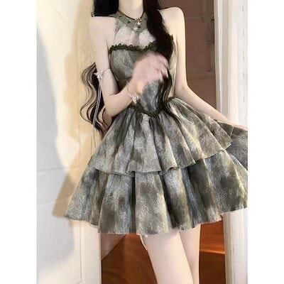 フレンチレトロな高級感重工業のおしゃれなフリル首かけレースのパッチワークスカート夏の新作ワンピース