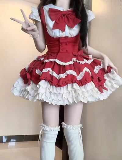 2024 ロリータ ドレス かわいい少女リボンシャツハイウエストフリルキャミソールスカートポンポンケーキスカート2点セット コスプレ ワンピース ロリータワンピース